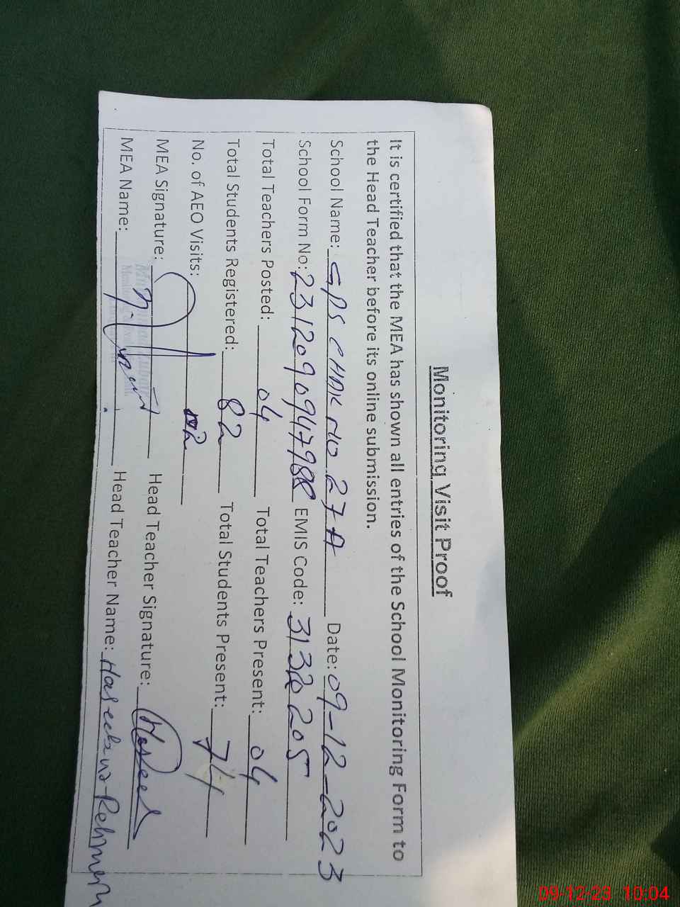 | Attendance Register | Head Teacher | MEA with School | Visit Proof |