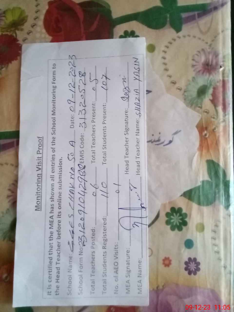 | Attendance Register | Head Teacher | MEA with School | Visit Proof |