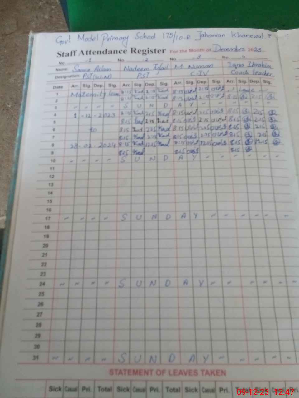 | CNIC | Full Name | Designation | R/C | Absence During Last Calender Month |
