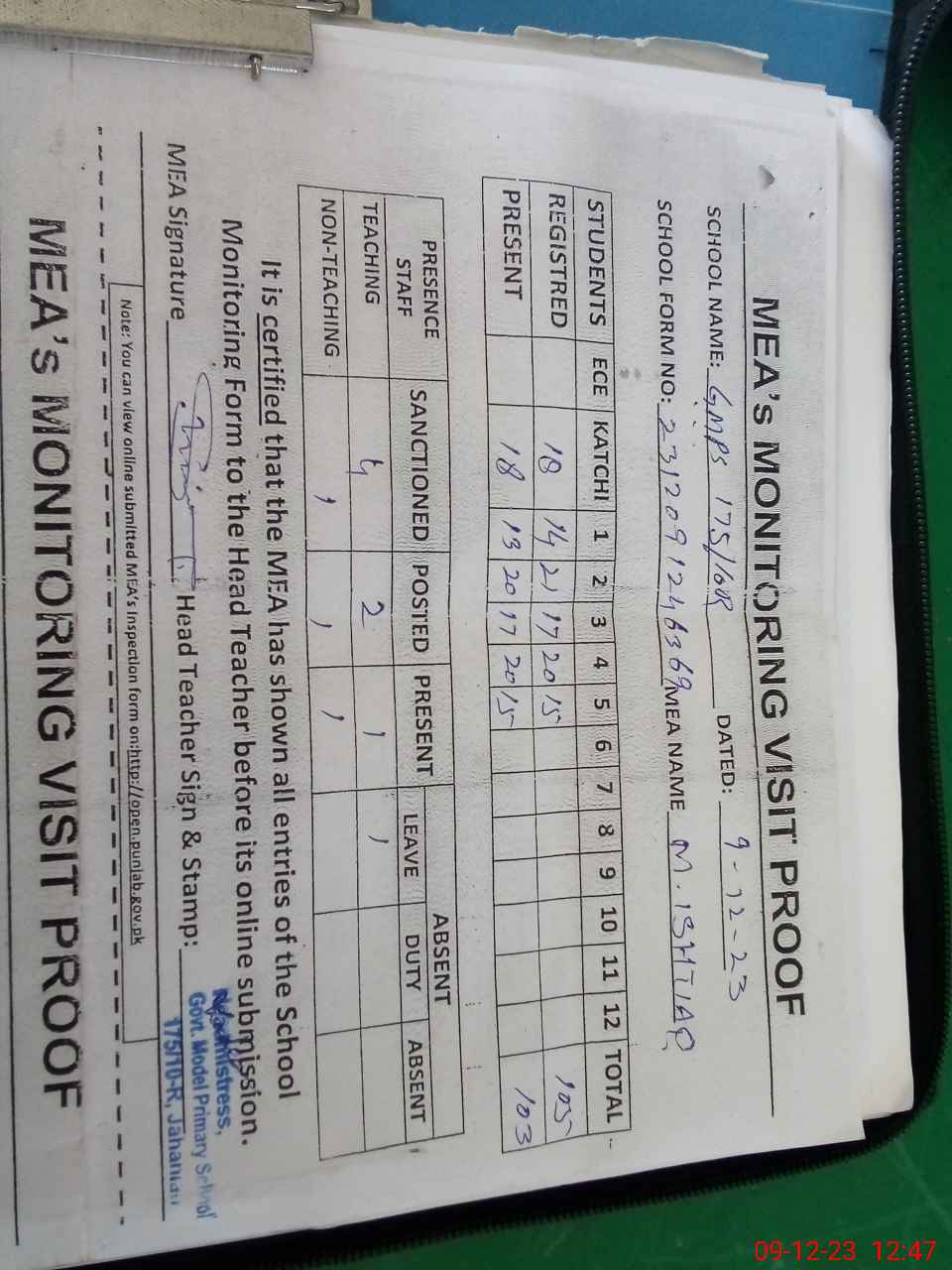 | Attendance Register | Head Teacher | MEA with School | Visit Proof |