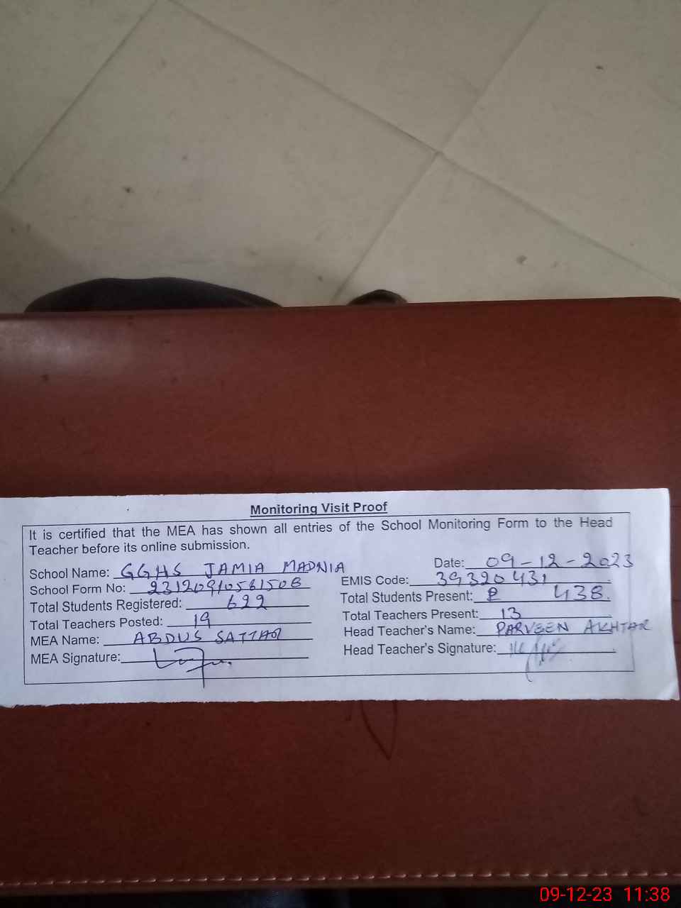 | Attendance Register | Head Teacher | MEA with School | Visit Proof |