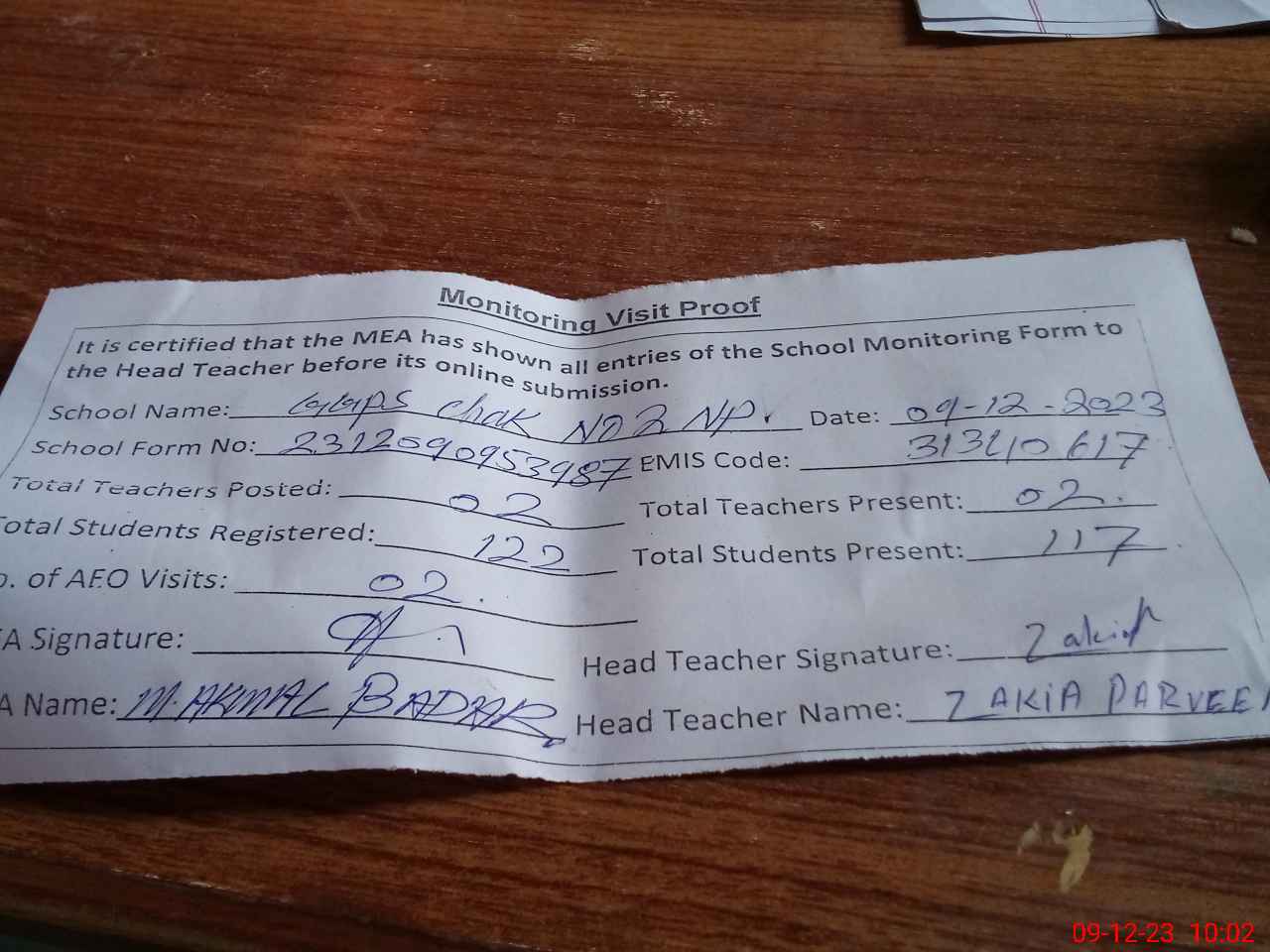 | Attendance Register | Head Teacher | MEA with School | Visit Proof |