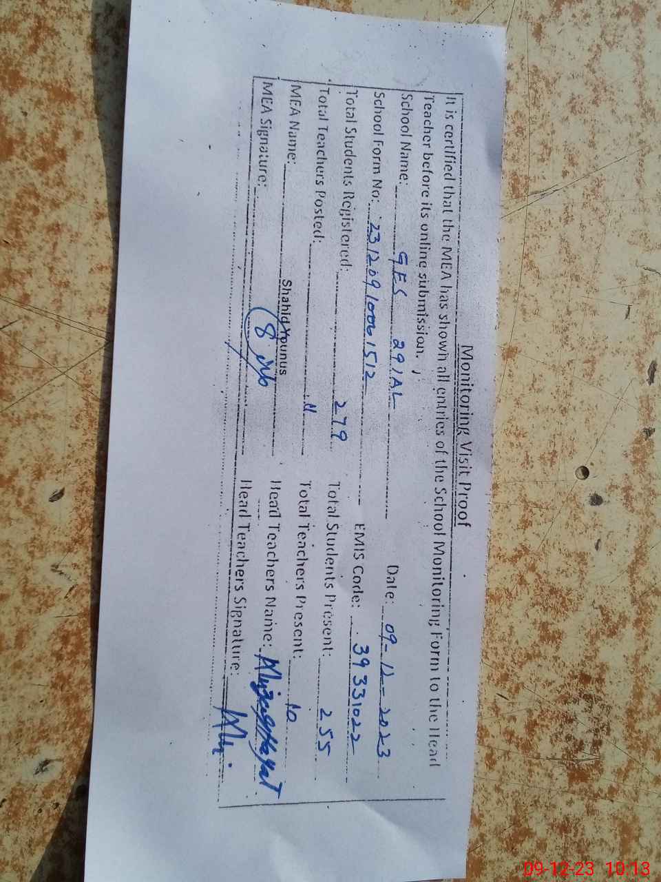 | Attendance Register | Head Teacher | MEA with School | Visit Proof |