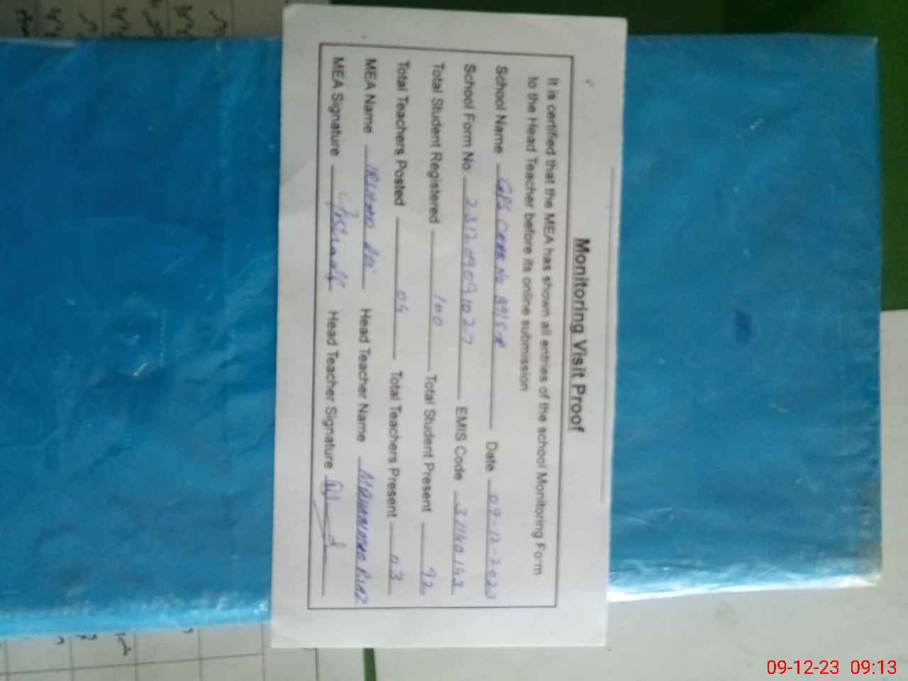 | Attendance Register | Head Teacher | MEA with School | Visit Proof |