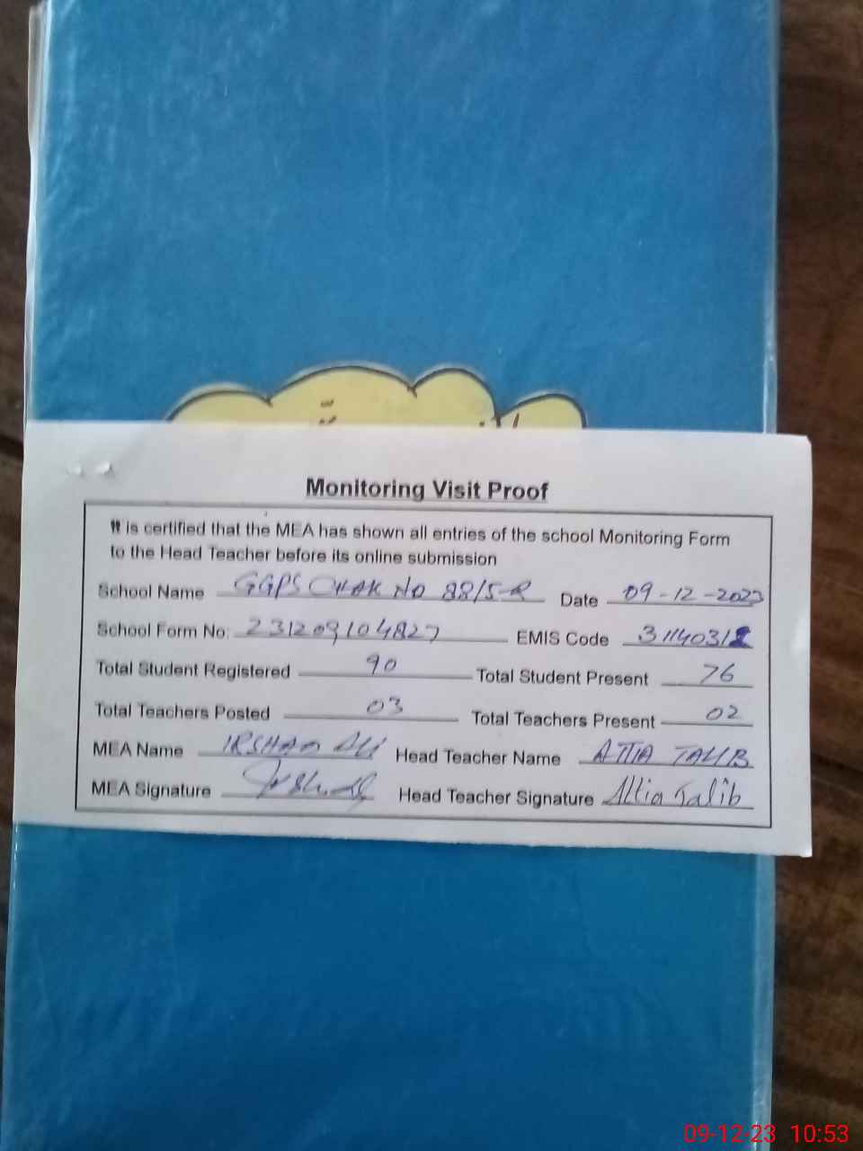 | Attendance Register | Head Teacher | MEA with School | Visit Proof |