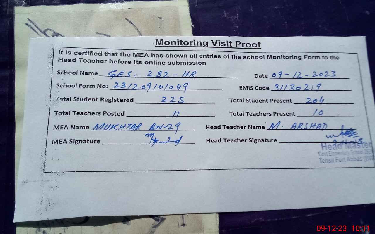 | Monitoring Date: 09-12-2023 | Start Time: 09-12-2023 09:39 AM | End Time: 09-12-2023 10:12 AM | Name of MEA: Mu**** ah**** BN**** 29 | |