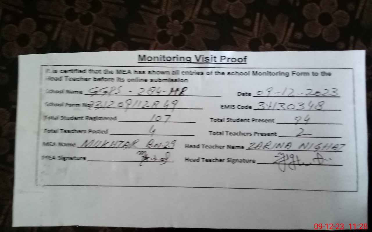 | EMIS Code: 31130348 | Name of School: GGPS CHAK NO 284 HR | |||