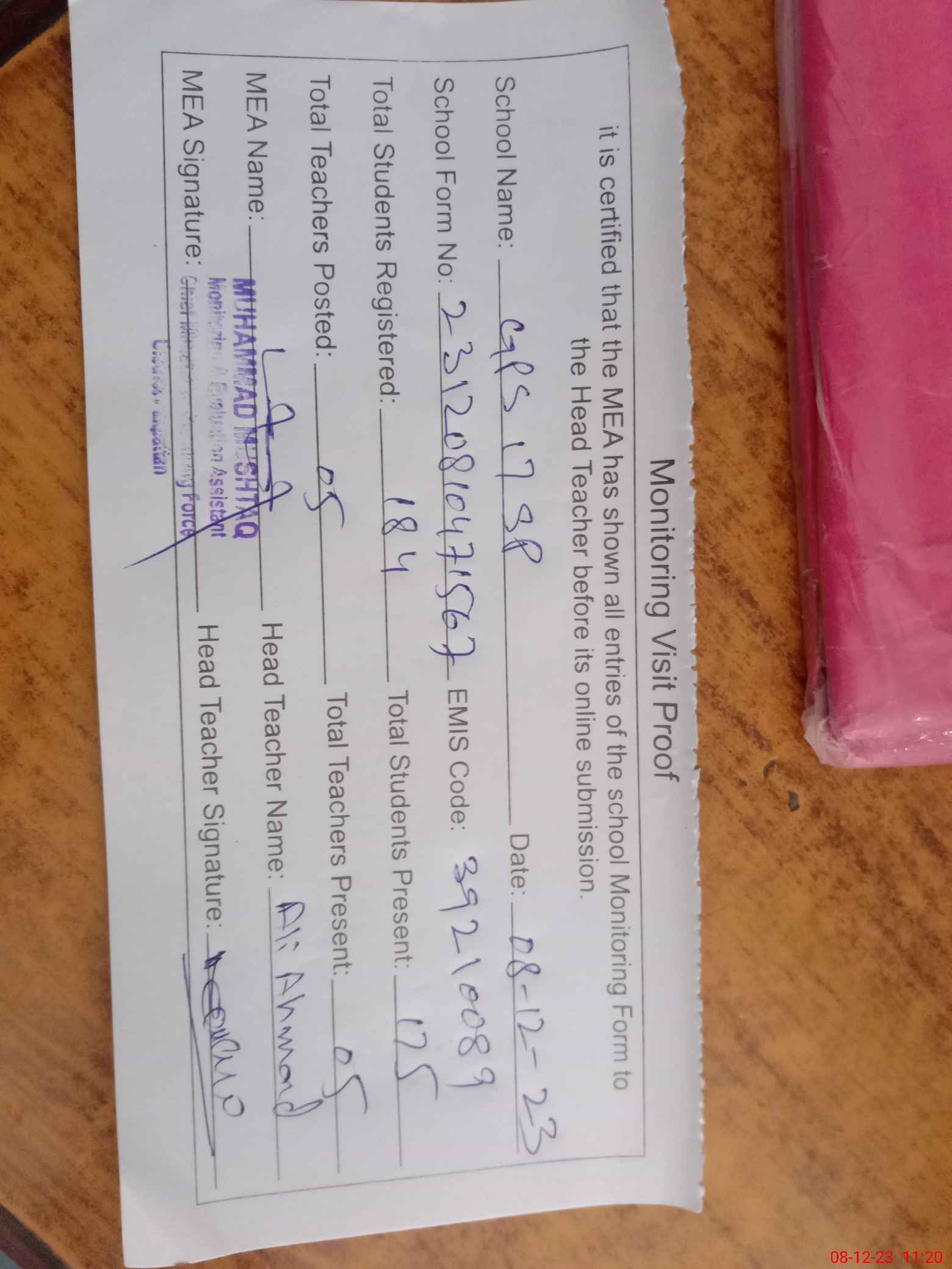 | Attendance Register | Head Teacher | MEA with School | Visit Proof |