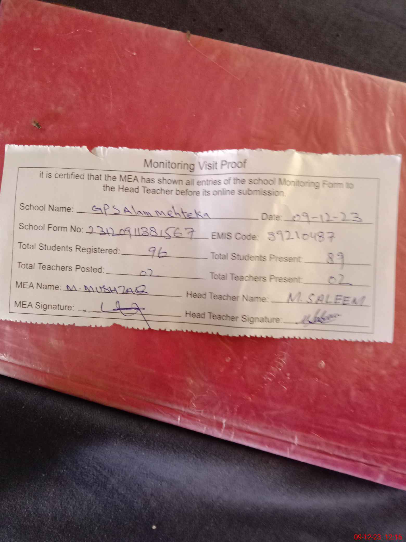 | Attendance Register | Head Teacher | MEA with School | Visit Proof |