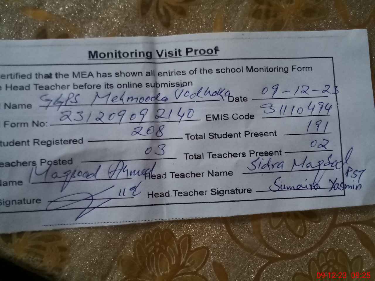 | EMIS Code: 31110494 | Name of School: GGPS MEHMOODA JODHEKA | |||