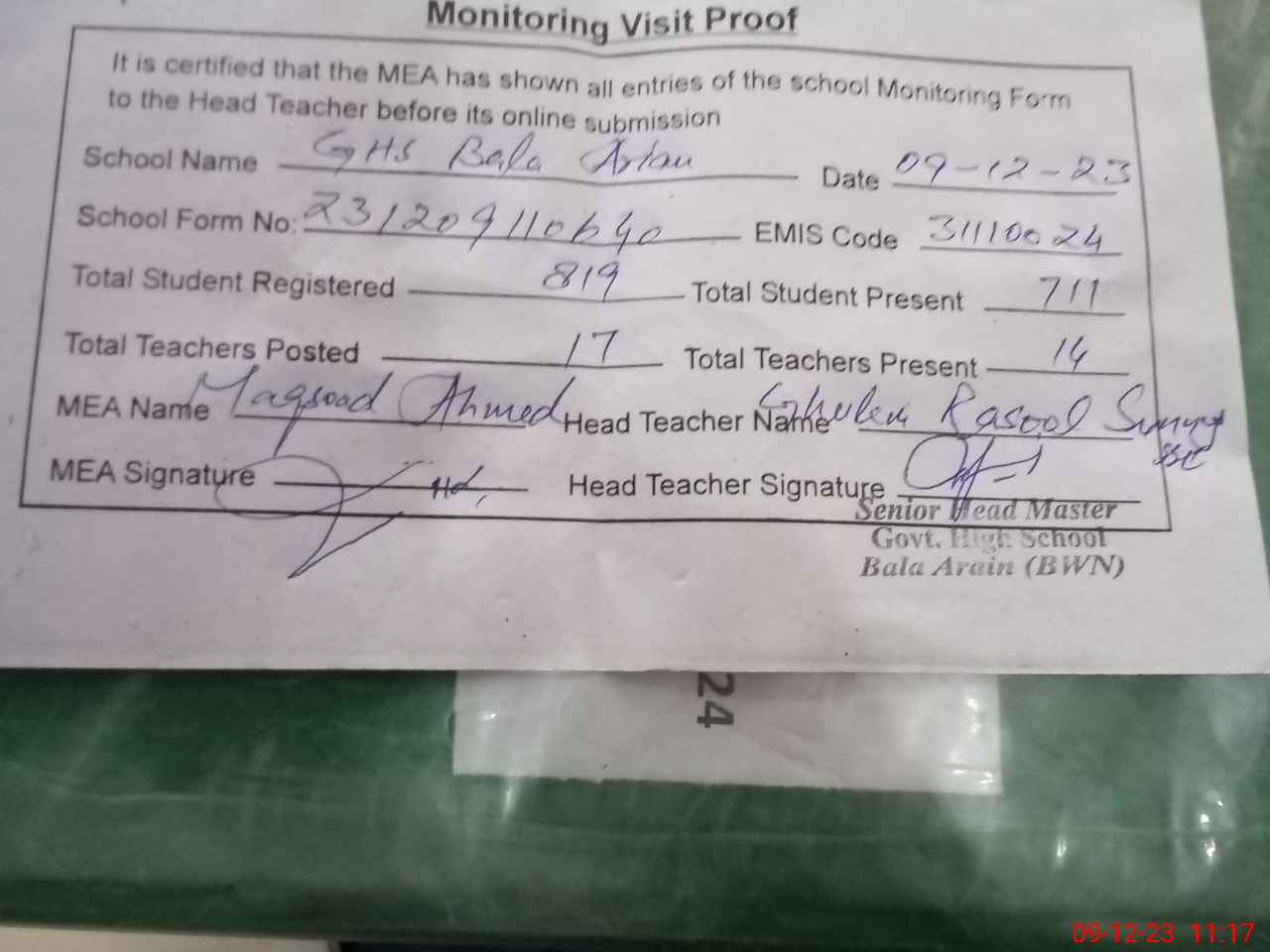 | EMIS Code: 31110024 | Name of School: GHS BALA ARIAN | |||