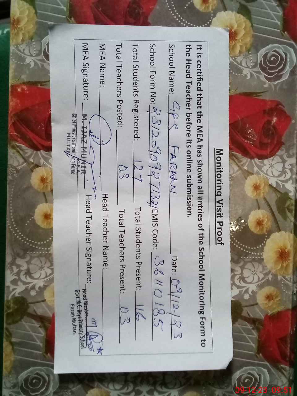 | Attendance Register | Head Teacher | MEA with School | Visit Proof |