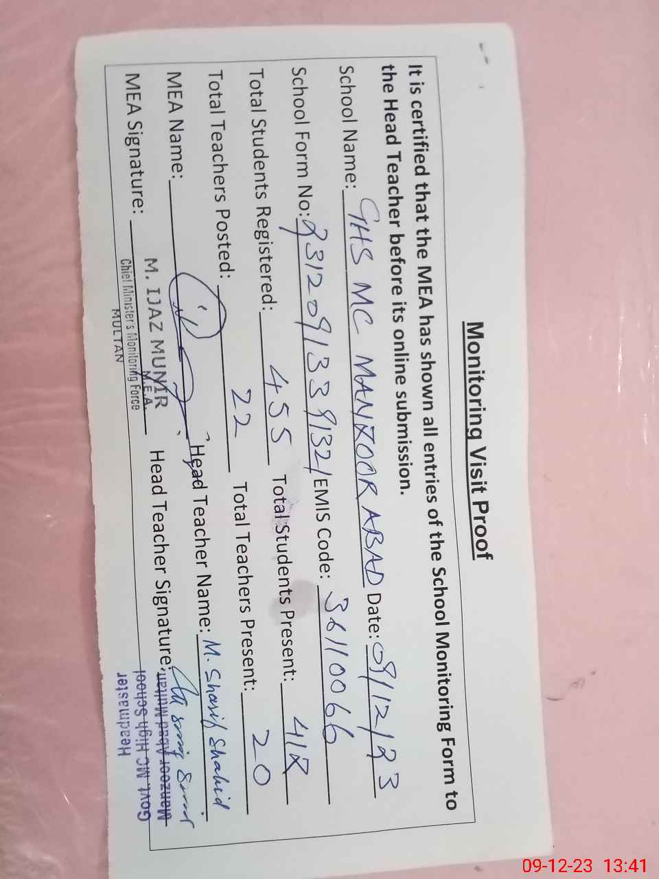 | Attendance Register | Head Teacher | MEA with School | Visit Proof |