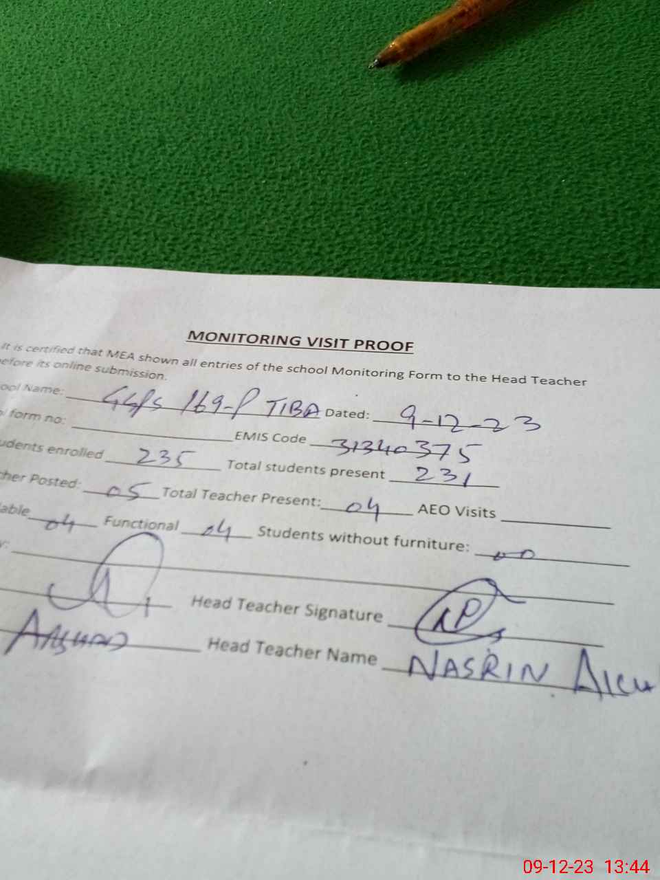 | Attendance Register | Head Teacher | MEA with School | Visit Proof |