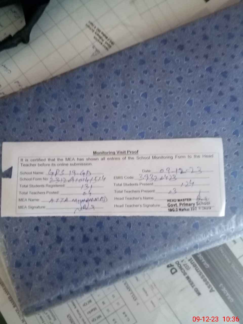 | Attendance Register | Head Teacher | MEA with School | Visit Proof |