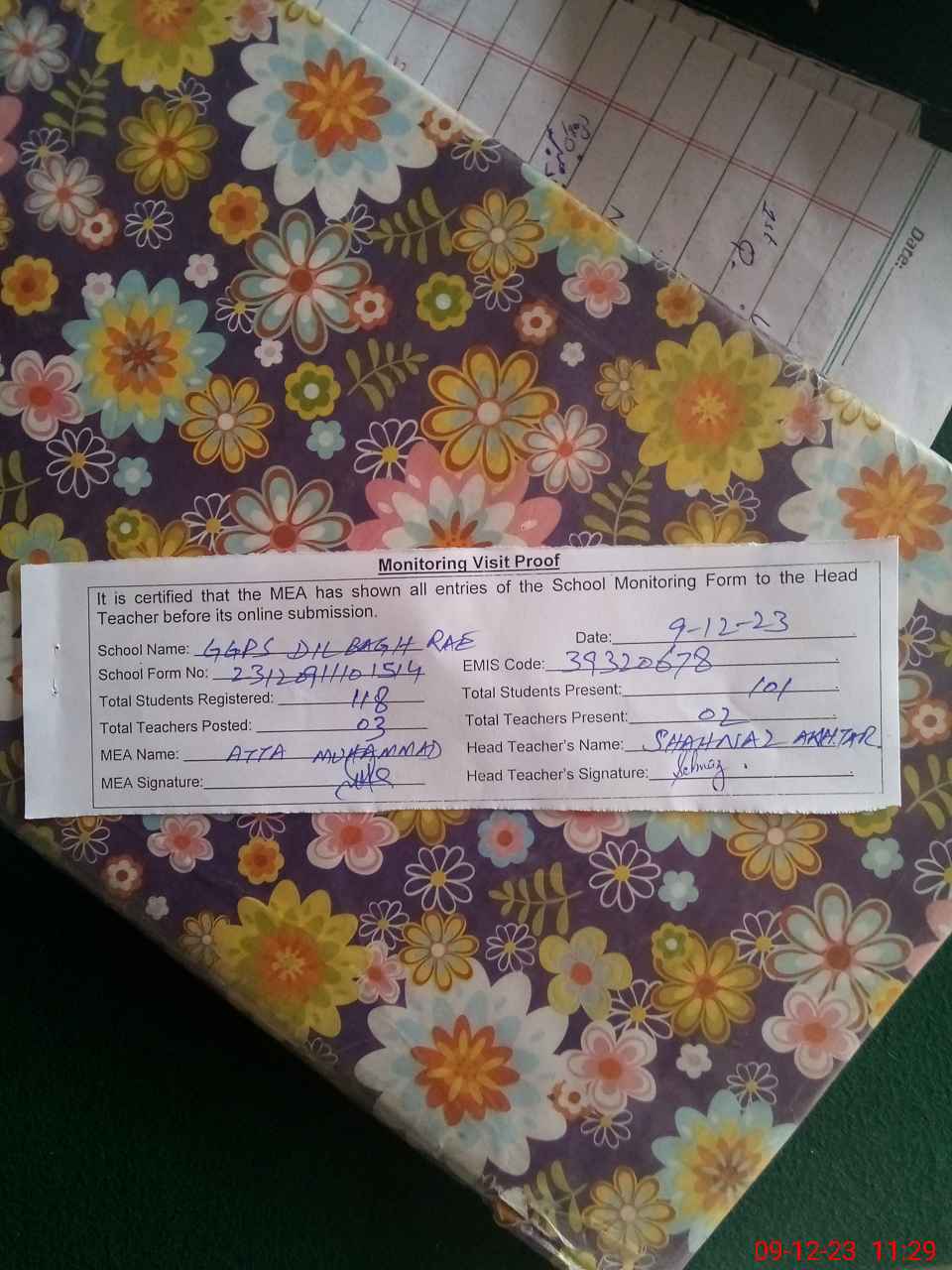 | Attendance Register | Head Teacher | MEA with School | Visit Proof |