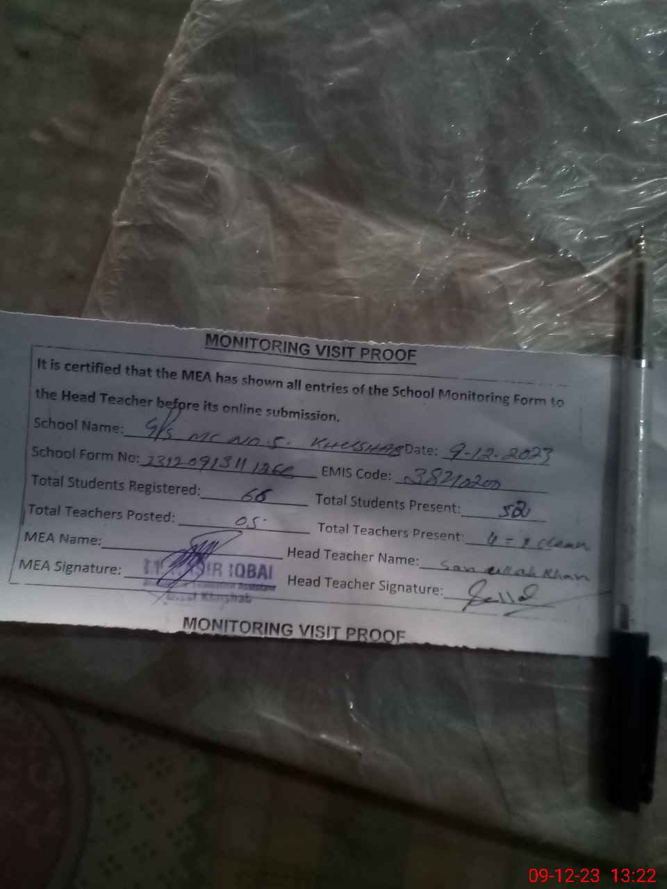 | Attendance Register | Head Teacher | MEA with School | Visit Proof |