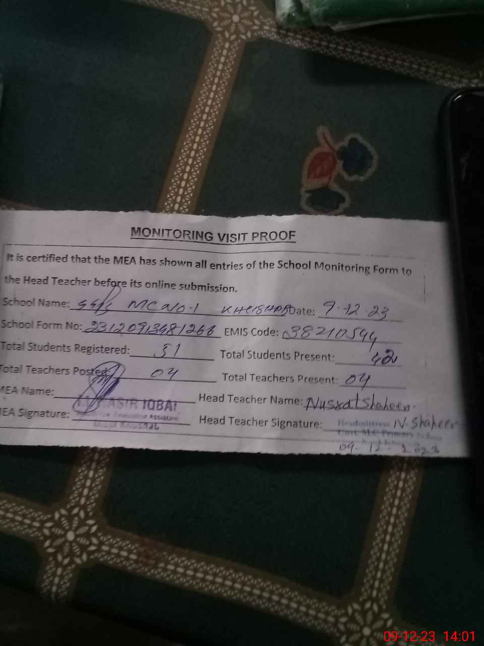| Attendance Register | Head Teacher | MEA with School | Visit Proof |