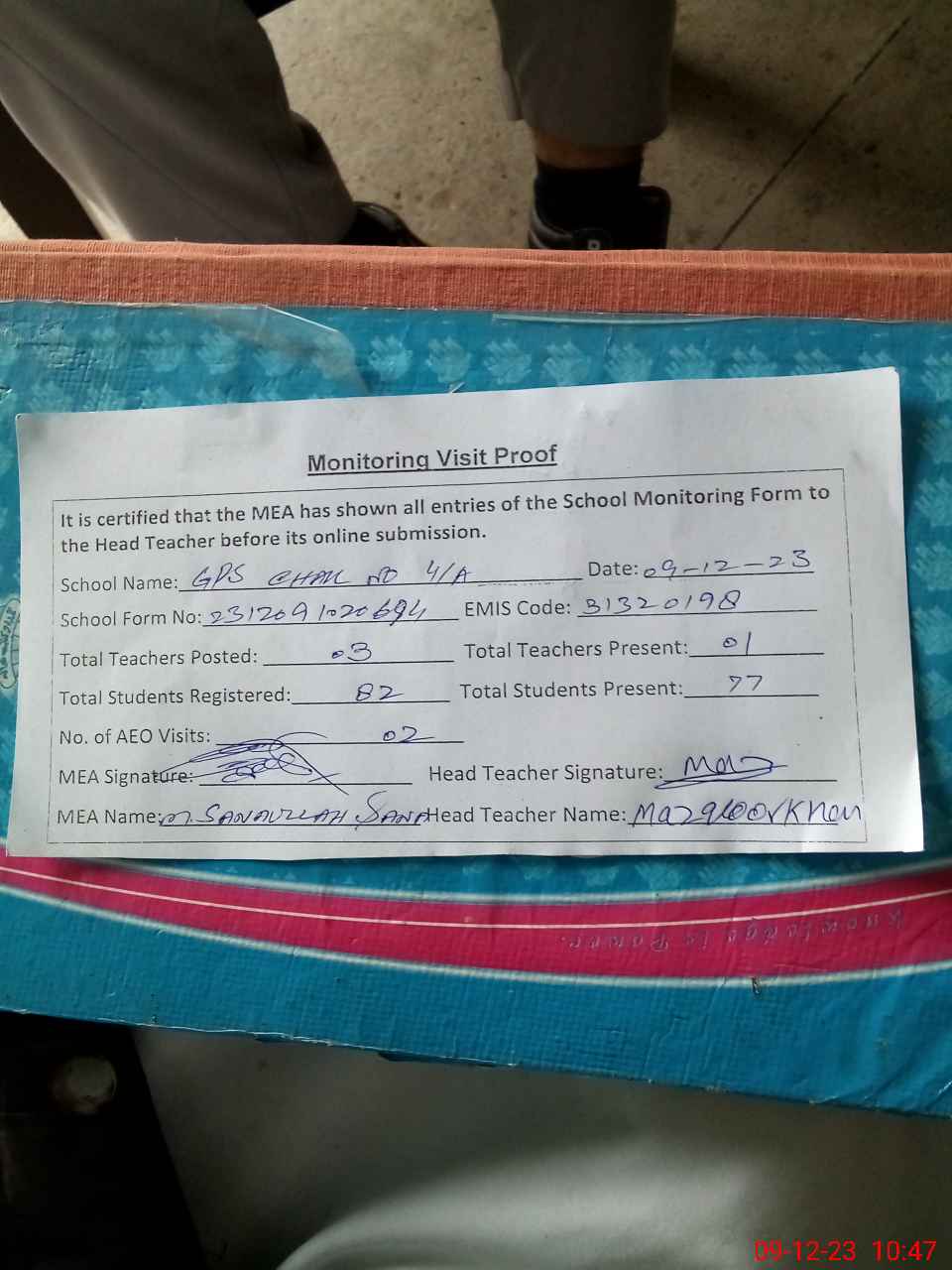| Attendance Register | Head Teacher | MEA with School | Visit Proof |