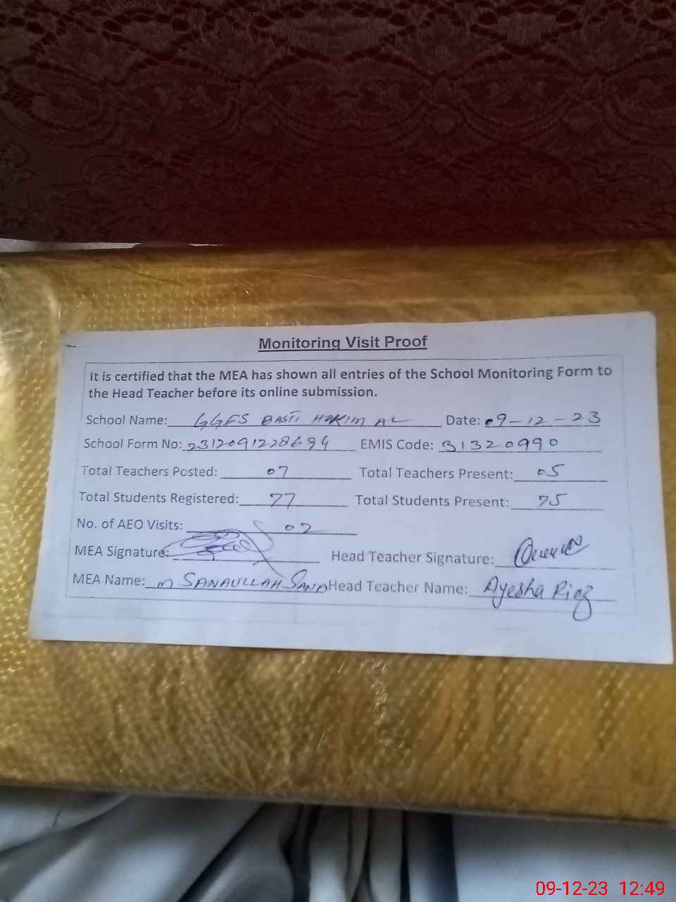 | Monitoring Date: 09-12-2023 | Start Time: 09-12-2023 12:27 PM | End Time: 09-12-2023 12:52 PM | Name of MEA: Mu**** Sa**** Ul**** Sa**** | |