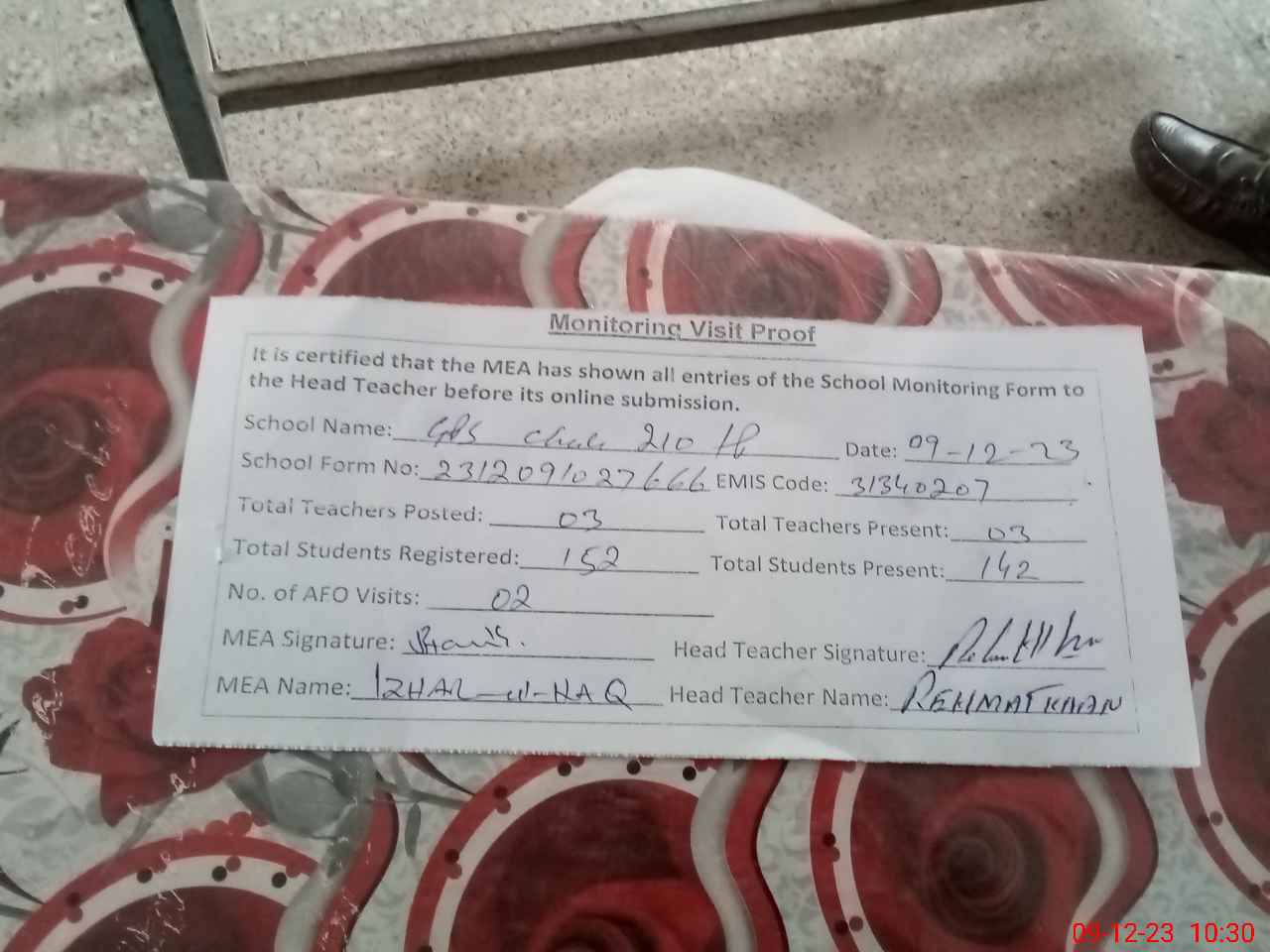 | Monitoring Date: 09-12-2023 | Start Time: 09-12-2023 09:54 AM | End Time: 09-12-2023 10:30 AM | Name of MEA: Mu**** Iz**** UlHa**** | |