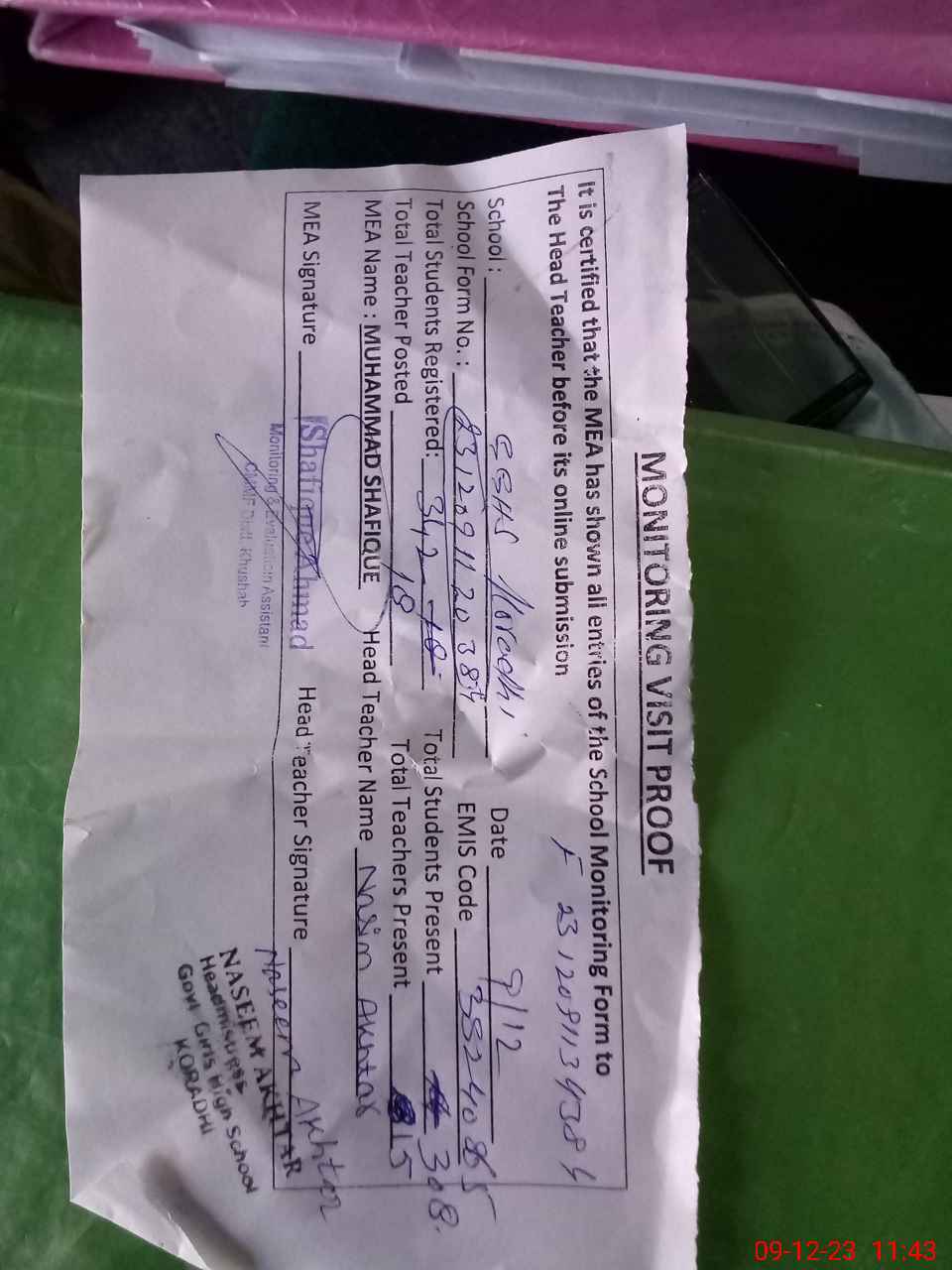 | Attendance Register | Head Teacher | MEA with School | Visit Proof |