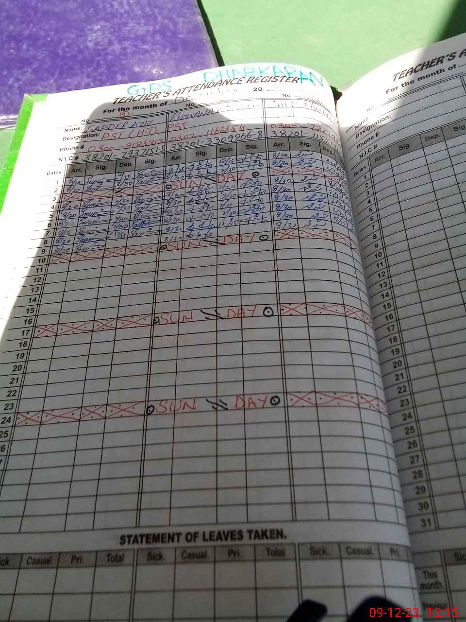 | CNIC | Full Name | Designation | R/C | Absence During Last Calender Month |