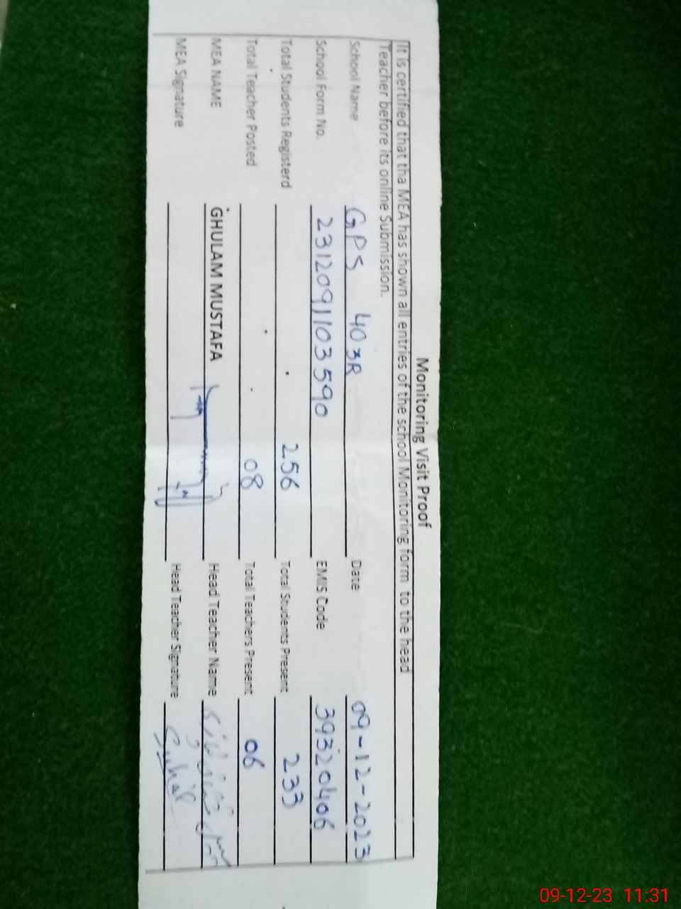| Attendance Register | Head Teacher | MEA with School | Visit Proof |