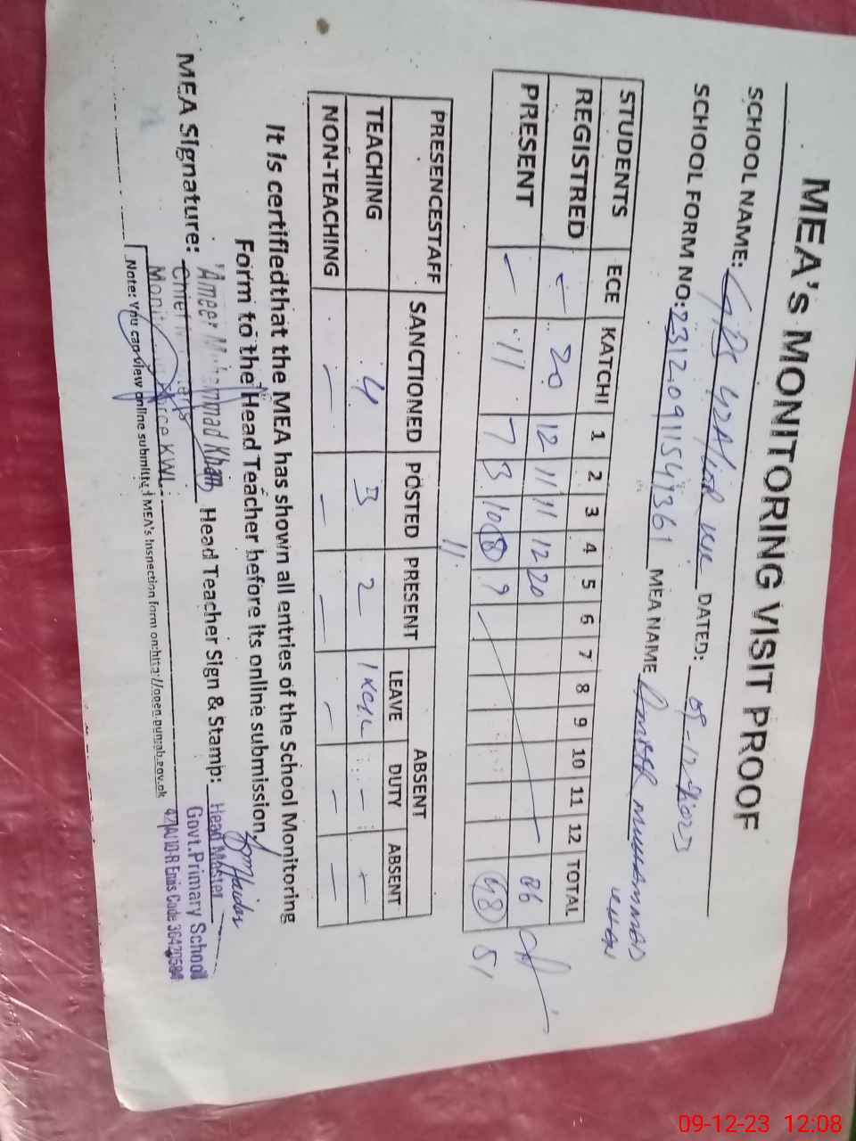 | Attendance Register | Head Teacher | MEA with School | Visit Proof |