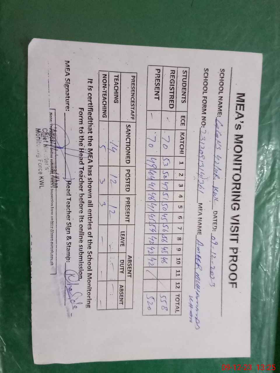 | Attendance Register | Head Teacher | MEA with School | Visit Proof |