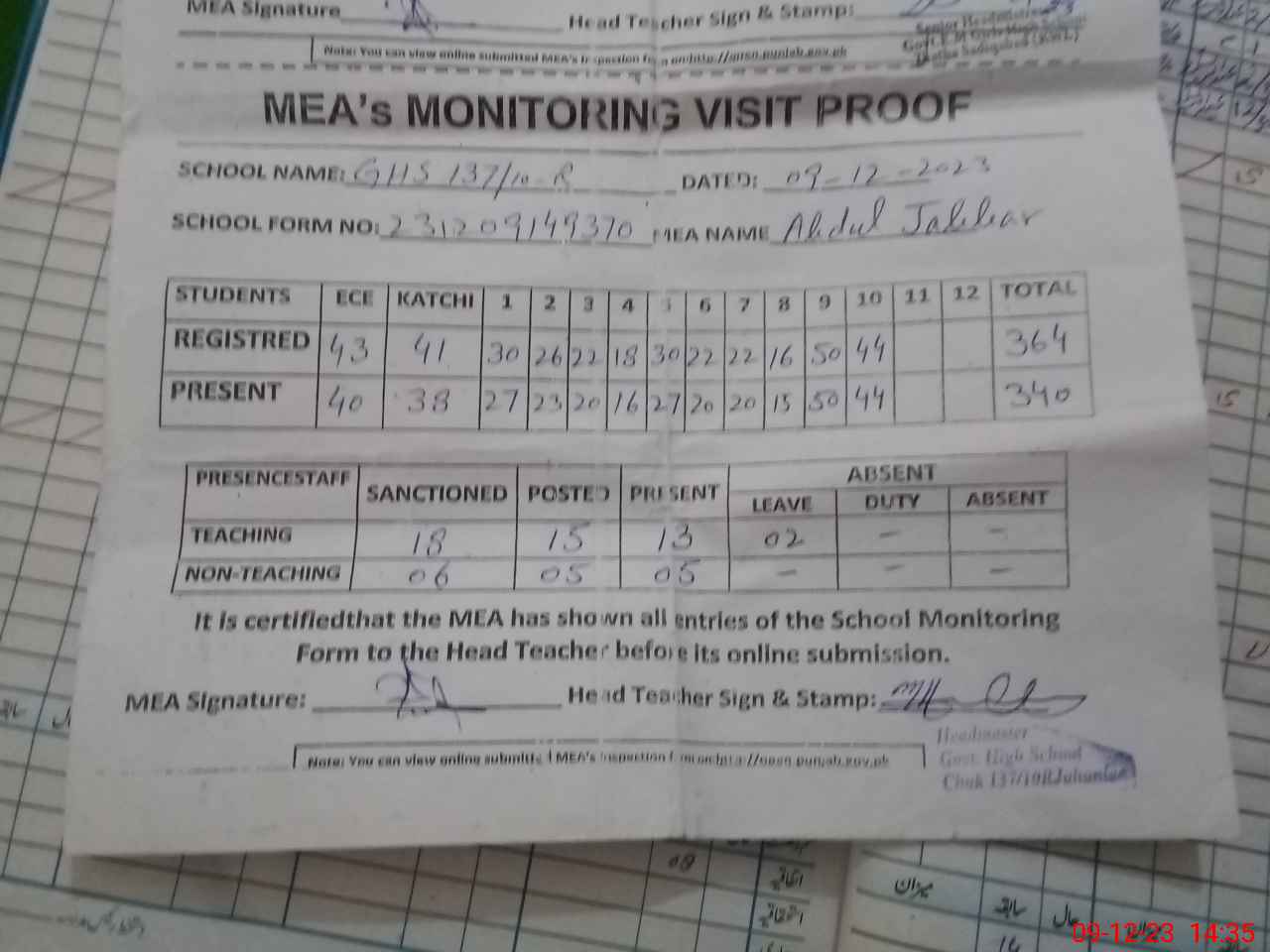 | Attendance Register | Head Teacher | MEA with School | Visit Proof |