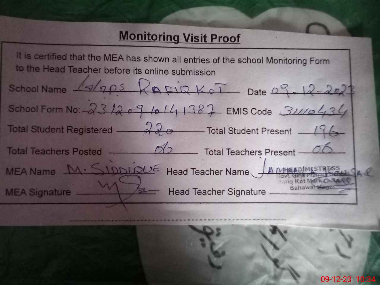 | Attendance Register | Head Teacher | MEA with School | Visit Proof |
