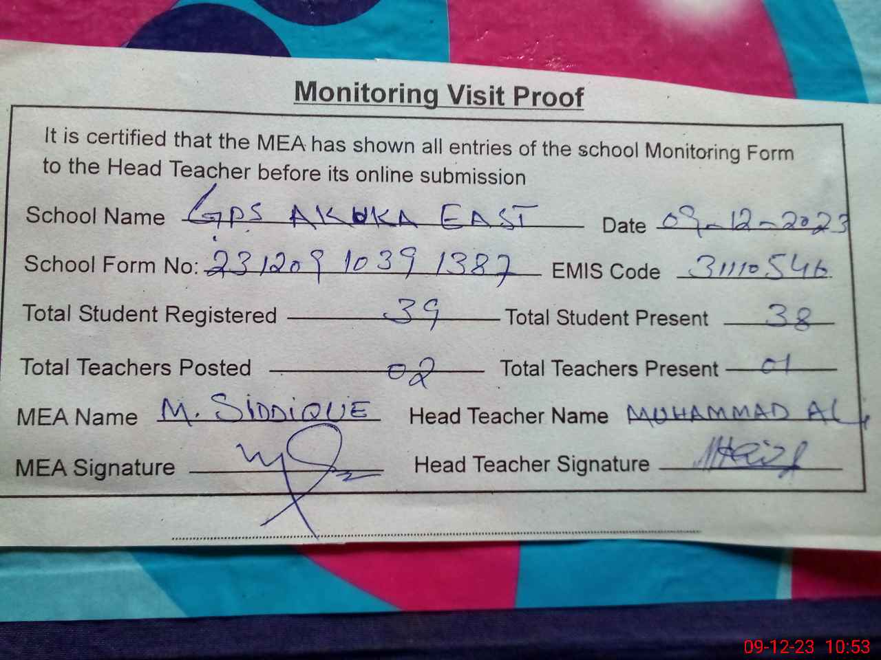 | Attendance Register | Head Teacher | MEA with School | Visit Proof |