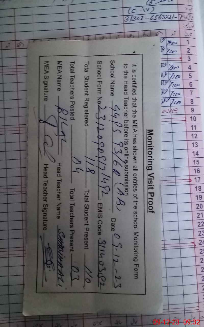 | Attendance Register | Head Teacher | MEA with School | Visit Proof |