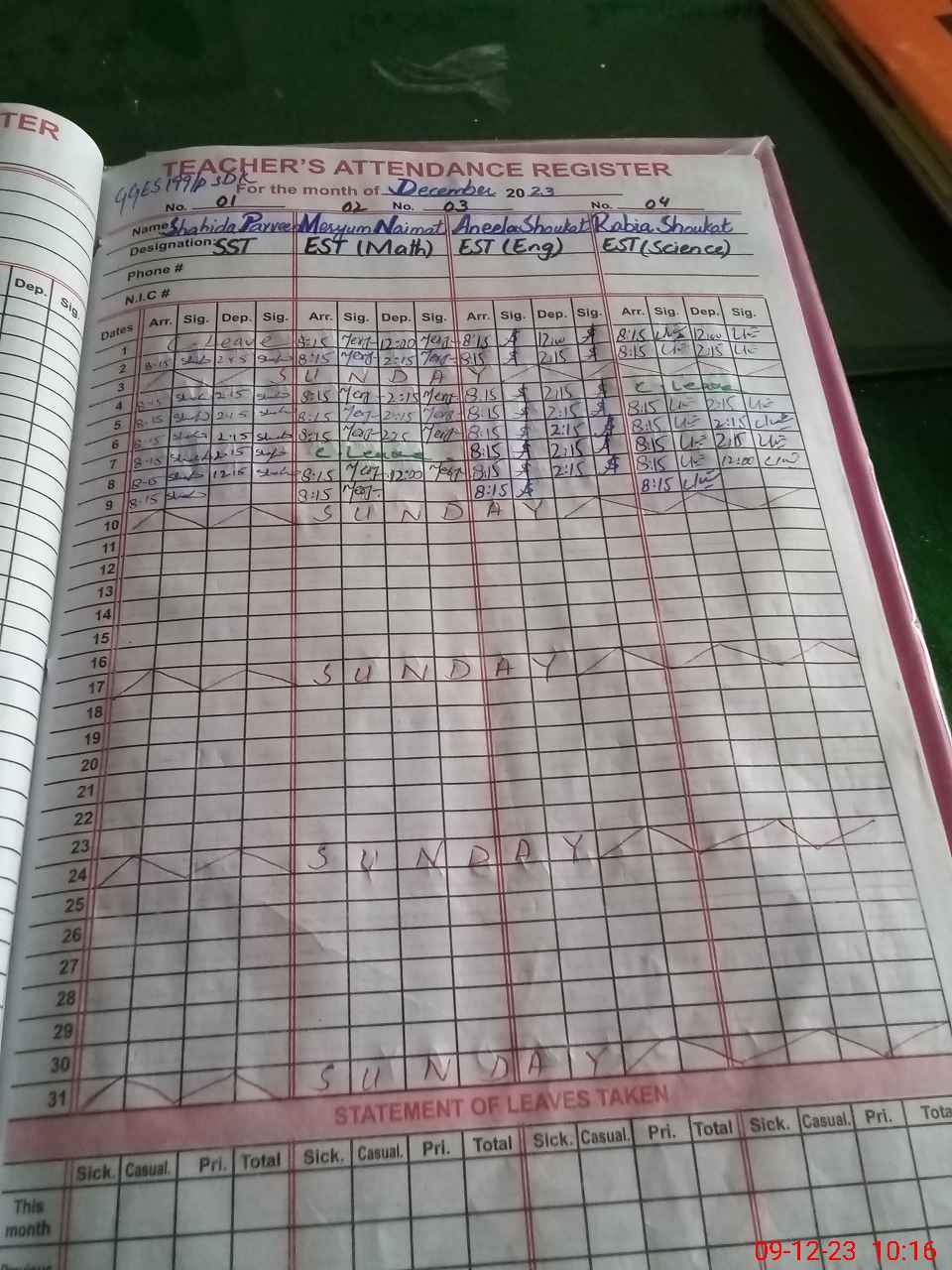| Leave | Duty | Absent | Maternity | Medical | Ex- Pak |