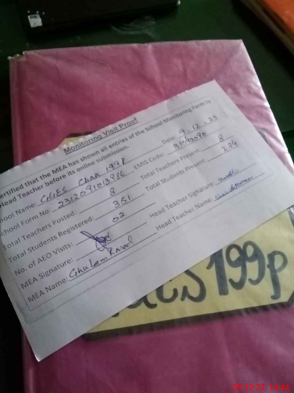 | Attendance Register | Head Teacher | MEA with School | Visit Proof |