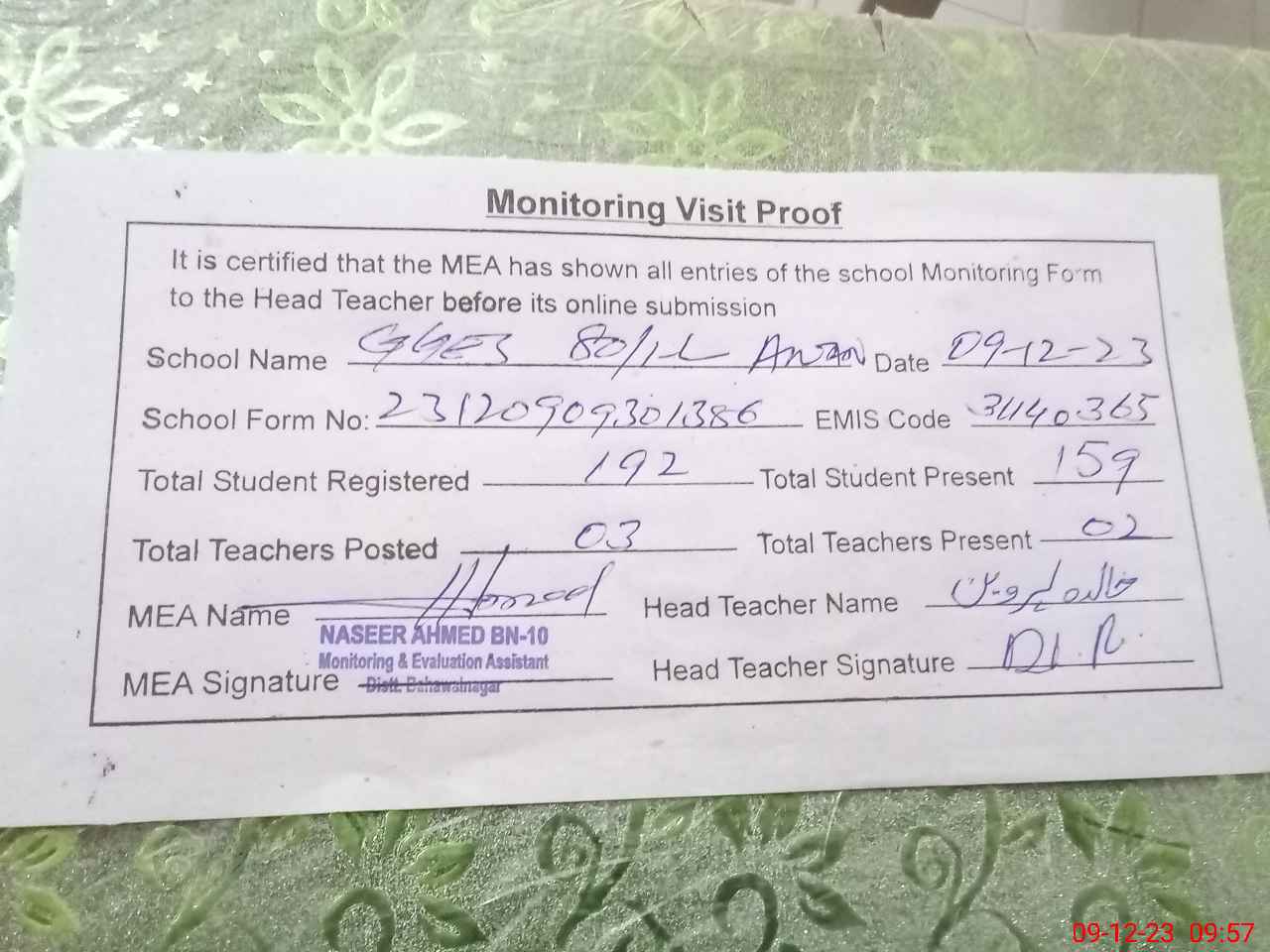 | Attendance Register | Head Teacher | MEA with School | Visit Proof |