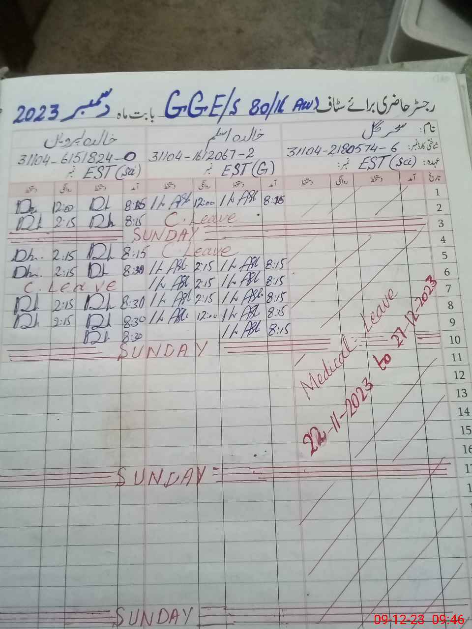 | CNIC | Full Name | Designation | R/C | Absence During Last Calender Month |