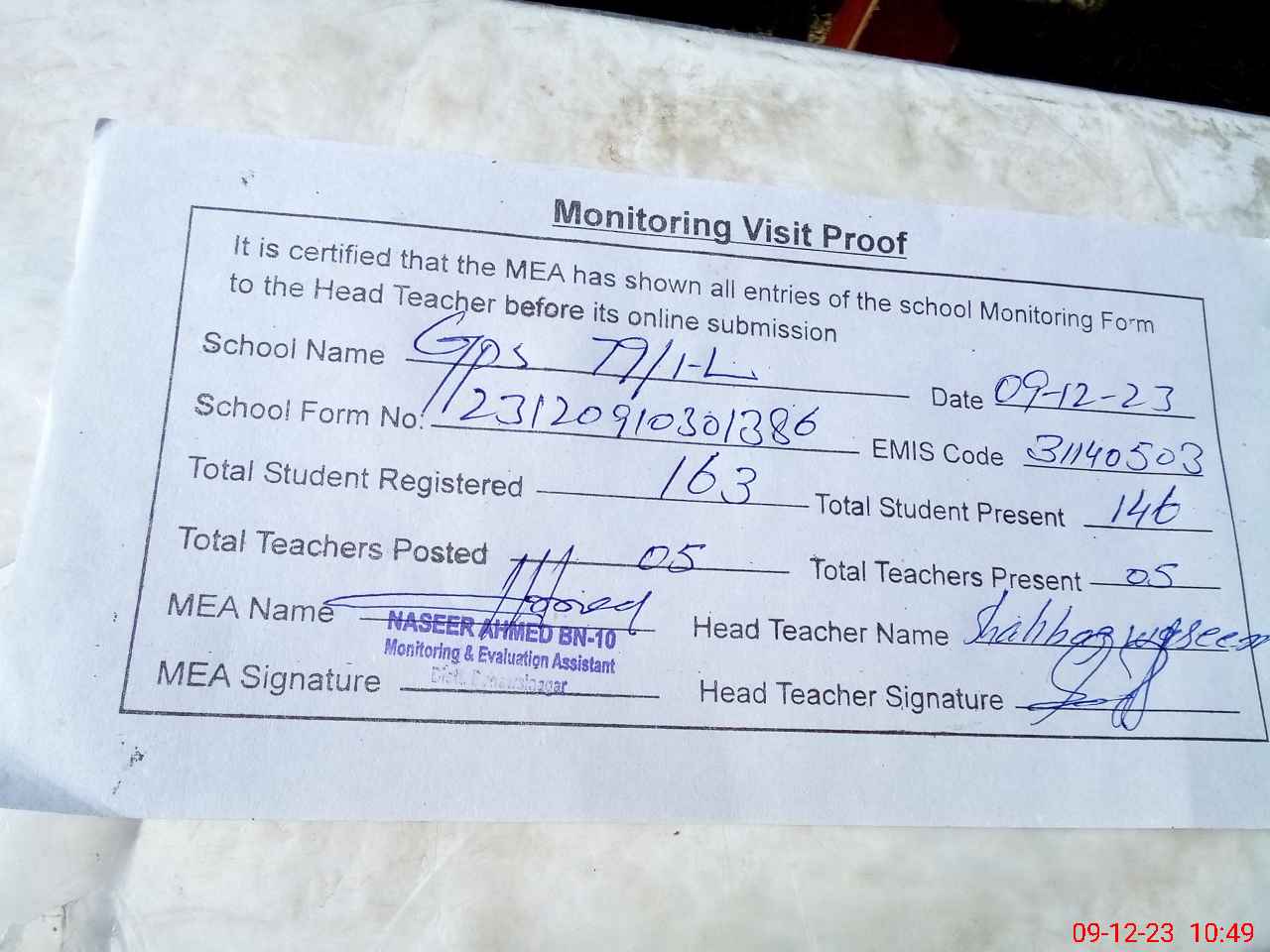 | Attendance Register | Head Teacher | MEA with School | Visit Proof |