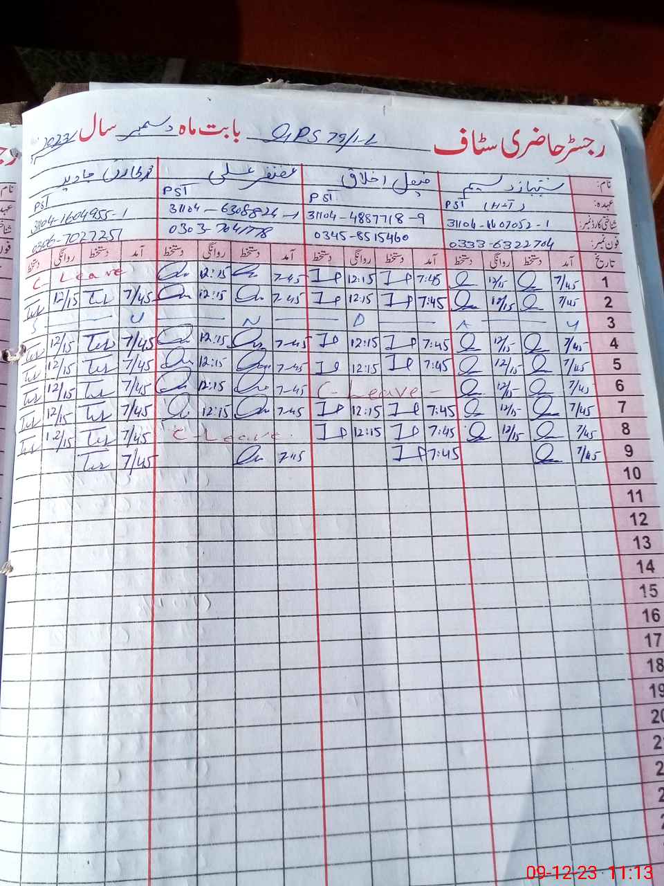 | CNIC | Full Name | Designation | R/C | Absence during last cal. month |