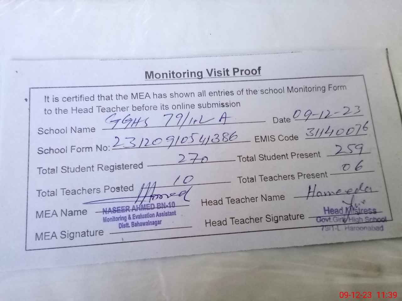 | EMIS Code: 31140076 | Name of School: GGHS 79/1-L HAROON ABAD | |||