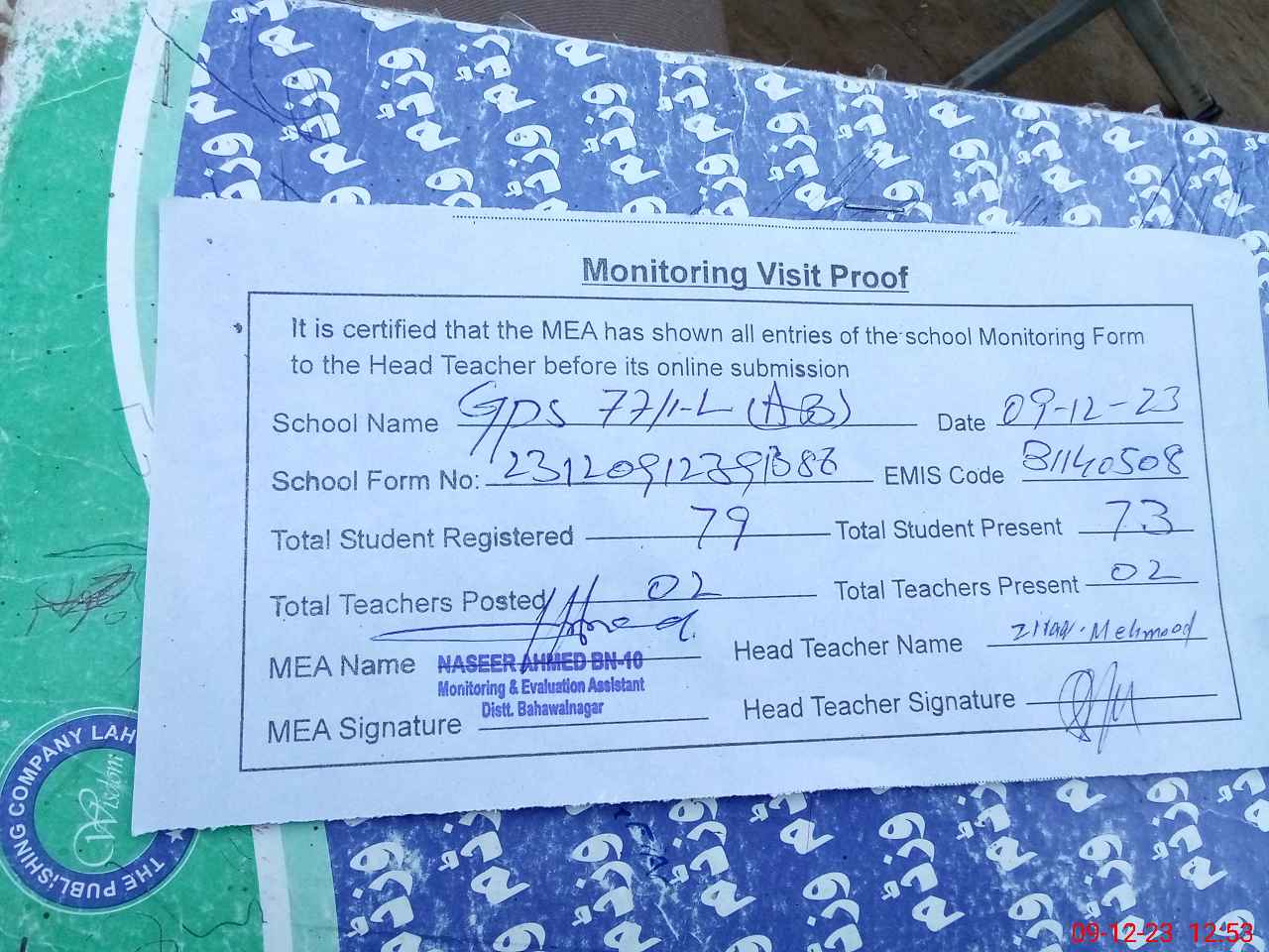 | Attendance Register | Head Teacher | MEA with School | Visit Proof |