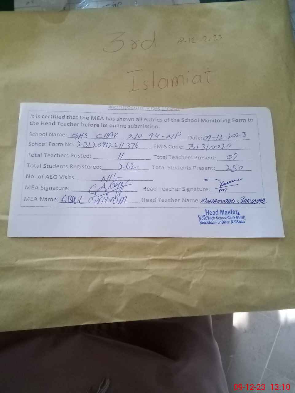 | Attendance Register | Head Teacher | MEA with School | Visit Proof |