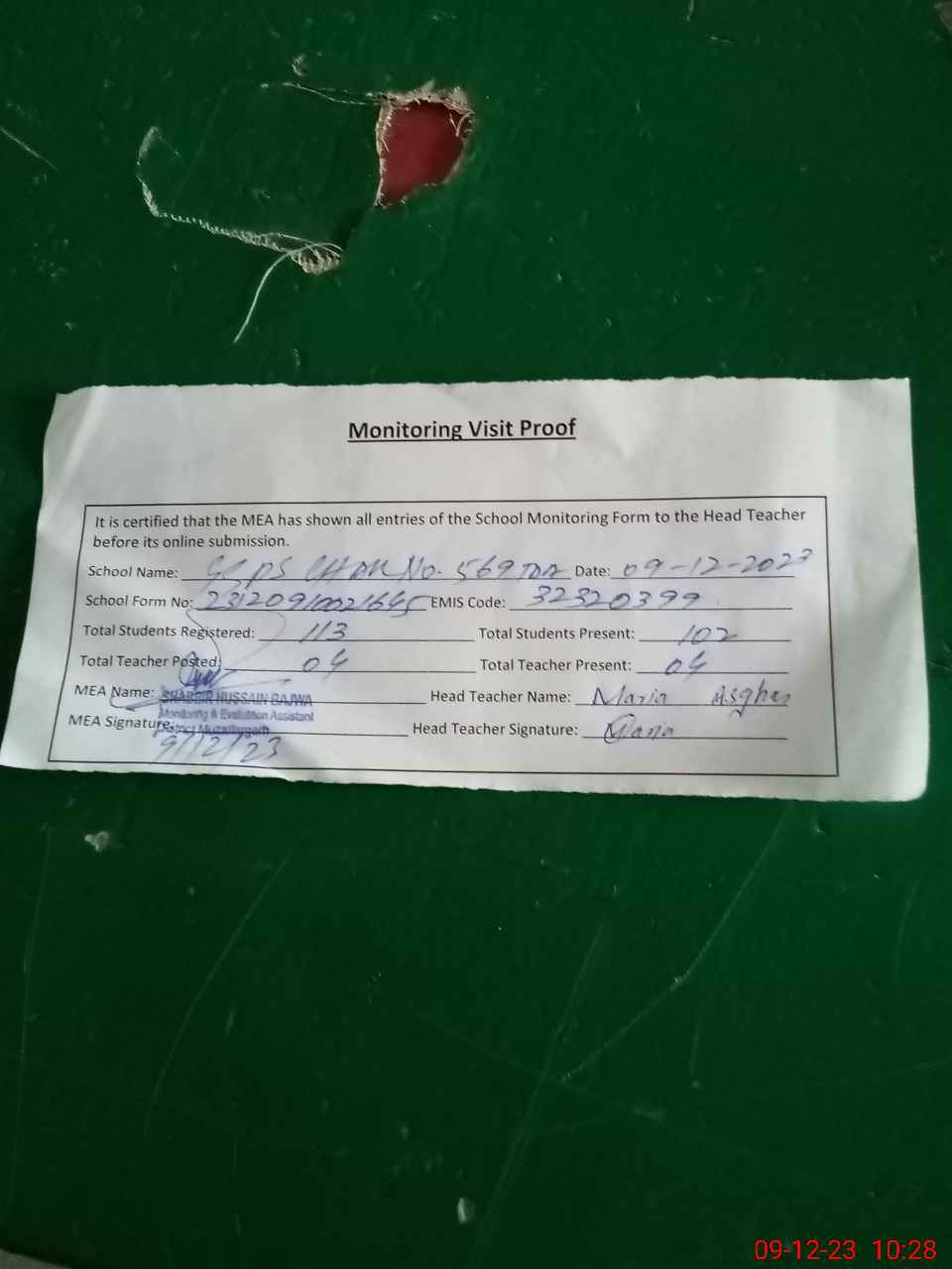 | Attendance Register | Head Teacher | MEA with School | Visit Proof |