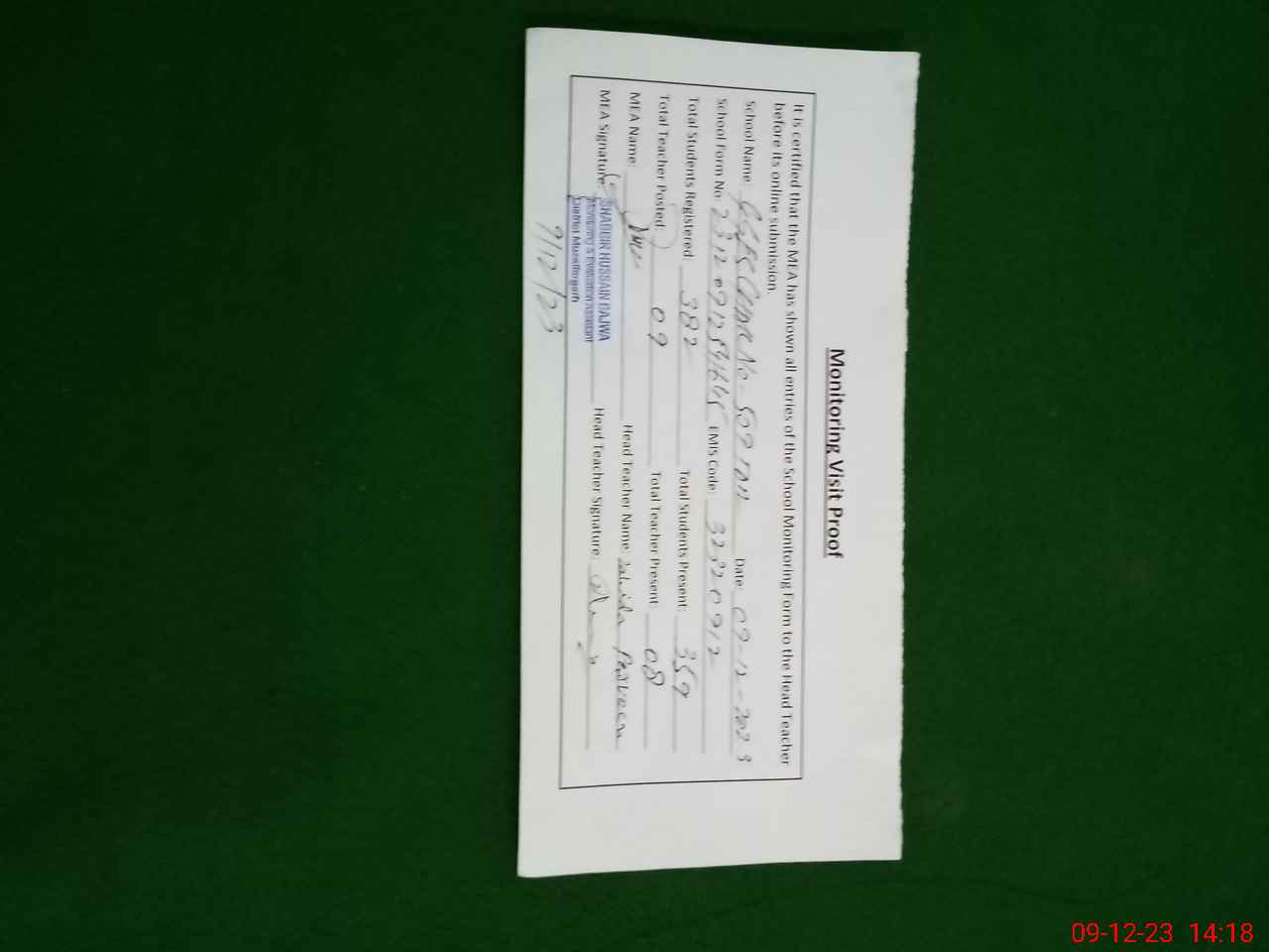 | Attendance Register | Head Teacher | MEA with School | Visit Proof |