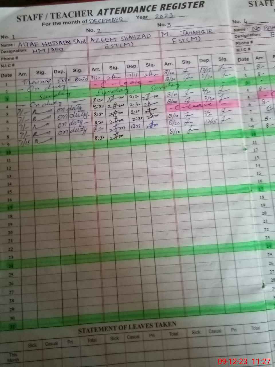 | CNIC | Full Name | Designation | R/C | Absence During Last Calender Month |