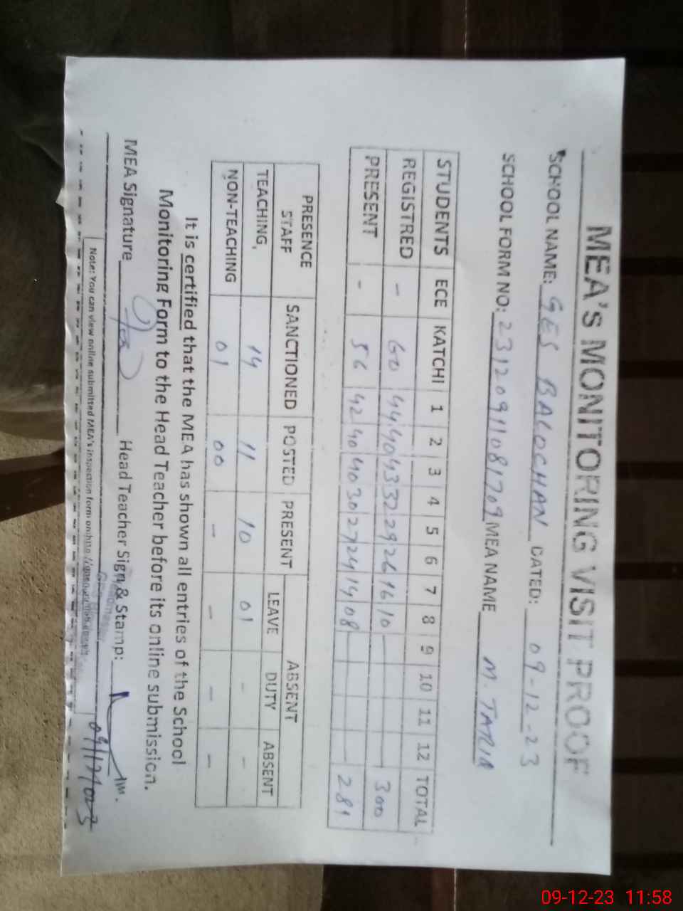 | Attendance Register | Head Teacher | MEA with School | Visit Proof |