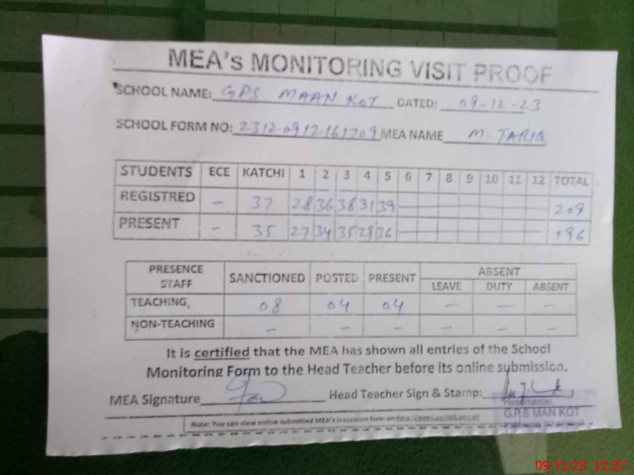 | Attendance Register | Head Teacher | MEA with School | Visit Proof |