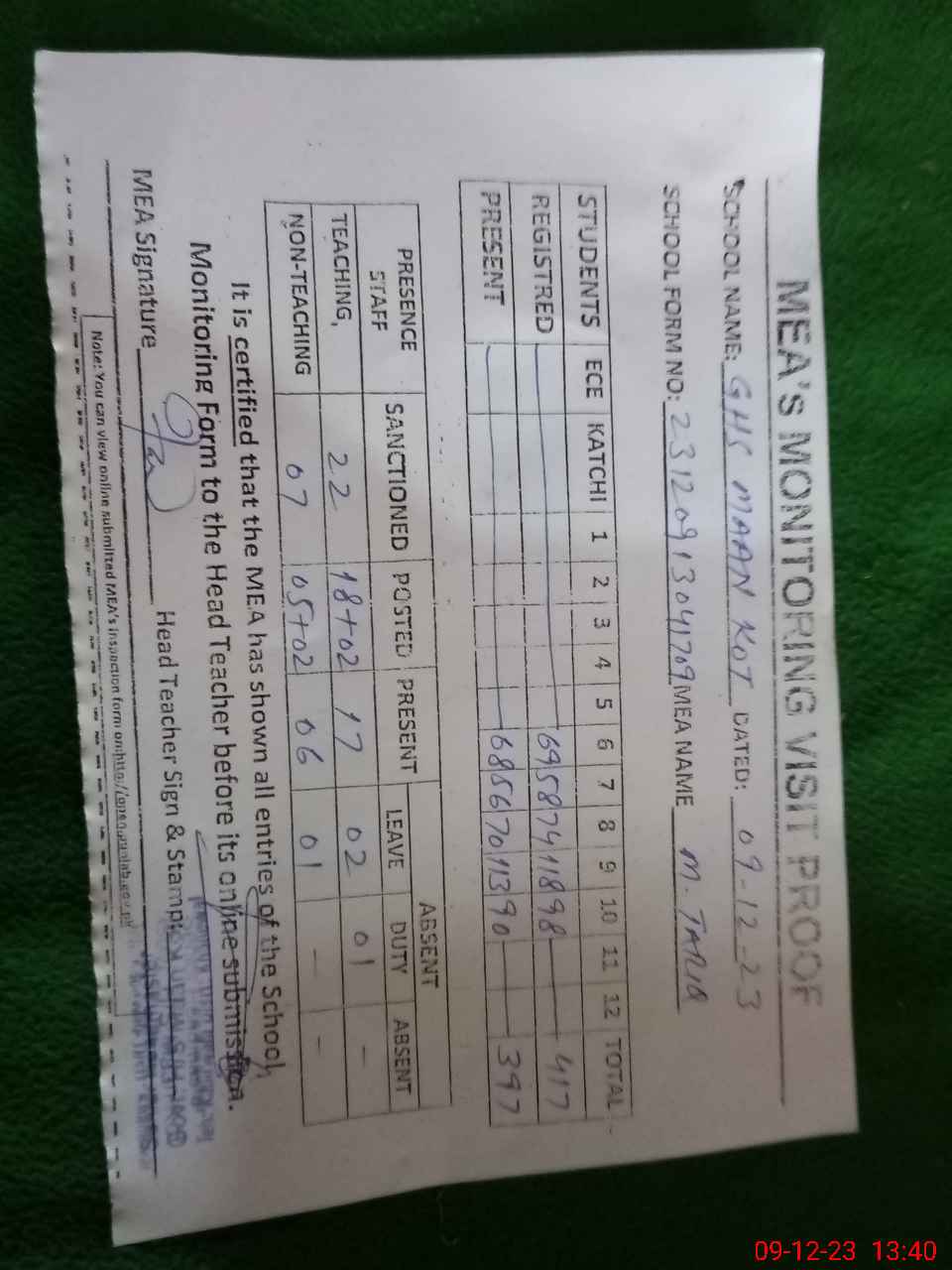| Attendance Register | Head Teacher | MEA with School | Visit Proof |