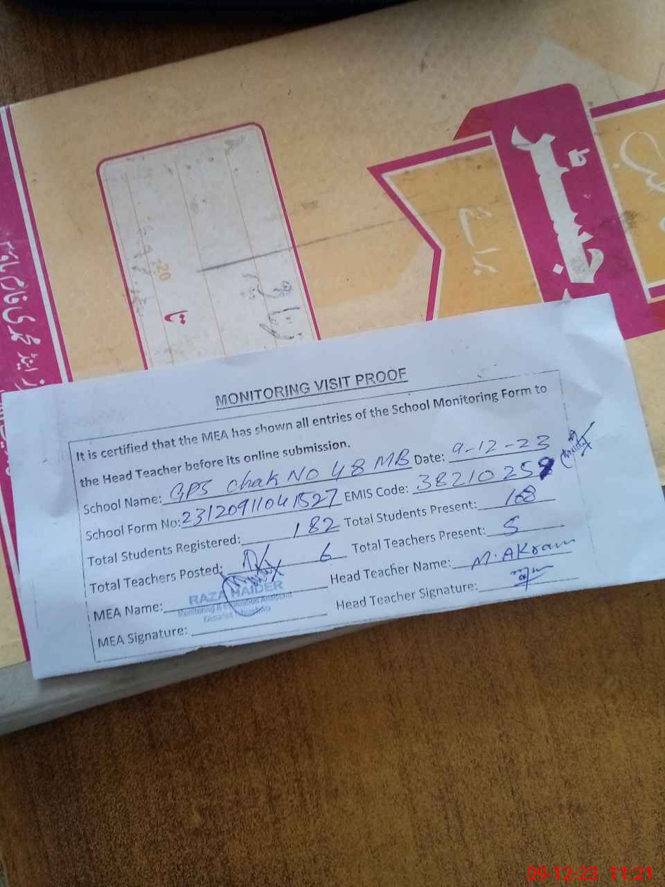| Attendance Register | Head Teacher | MEA with School | Visit Proof |